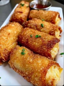- Garnish: Arrange the egg rolls on a platter, garnish with sliced scallions.